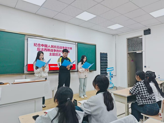 活动中,赵桂英书记从九月三日的阅兵作为开始,以中国共产党建党历程切入,系统梳理党在不同历史时期的奋斗脉络,重点讲述了中国人民抗日战争暨世界反法西斯战争的关键节点与伟大胜利,深刻阐释了“中国共产党是全民族抗战的中流砥柱”的历史逻辑。同时,结合青年团员的成长需求,她将历史与现实相衔接,引导团员从红色历史中汲取精神力量,明确新时代青年应肩负的责任与使命。宣讲结束后,同学们又朗诵了毛主席诗词《卜算子·咏梅》《沁园春·雪》《七律·长征》,表达自己对红色历史的深刻感悟、对革命先辈的崇敬之情,以及将历史精神转化为血液动力、主动担当新时代青年使命的坚定决心。